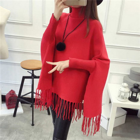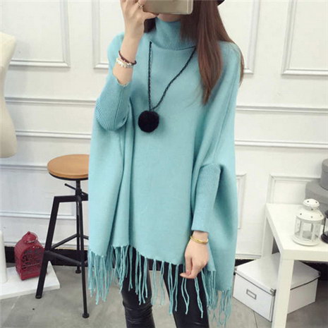 秋冬宽松韩版纯色蝙蝠袖流苏针织斗篷披肩女装