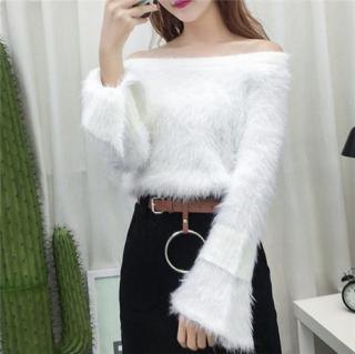 新款秋毛衣一字领开叉喇叭袖貂毛毛衣