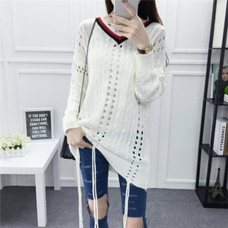秋冬韩版镂空深V领宽松羊毛衫 杨幂同款毛衣